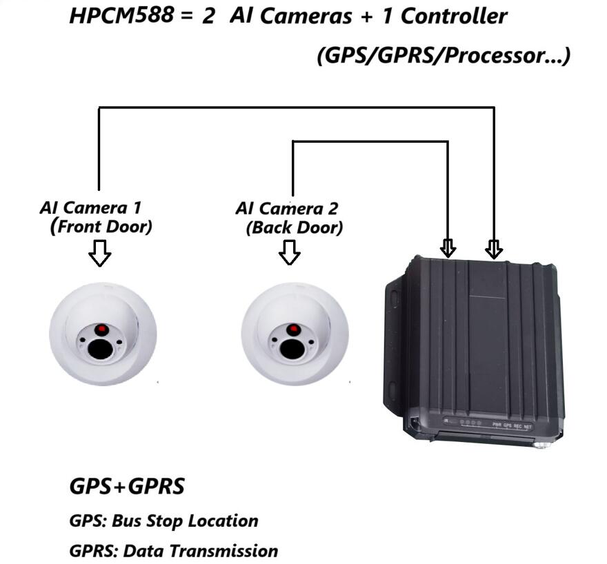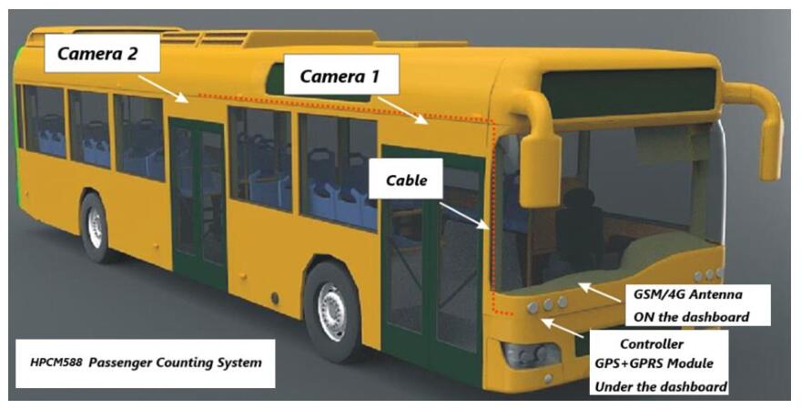 The AI passenger counting camera of the MRB HPCM588 is fixed on the top position of the bus door, and adopts a vertical downward shooting mode to capture real-time dynamic images of the door area. The collected image data is transmitted to the data box (controller) through a dedicated cable for professional image processing and analysis. The system can accurately identify and count the number of passengers boarding and alighting at each door of the bus, and can also realize real-time statistics of the total number of passengers in the bus according to the actual operation needs of the bus company. The data box is built-in with GPS and 4G wireless transmission modules, which can directly upload all the counted passenger flow data to the cloud platform in real time, and can also realize seamless data interconnection and sharing with various third-party operation and management systems through standard communication interfaces.